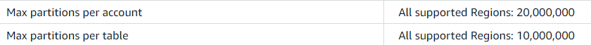 Glue를 사용하지 않는 경우는 고작 테이블당 2만개만 허용됩니다. Quota 증가를 요청하 수 있지만 이 역시 무한대로 늘려주지 않습니다.