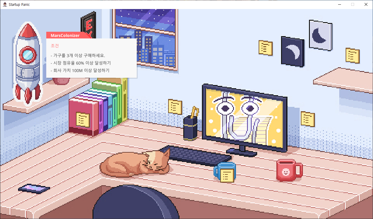 이 역시 시간 제한으로 점유율이 올라갔다 내려갔다 한다. - 라이벌 등장과 점유율 디버프로 월소득이 마이너스가 되면 보유 현금이 급격히 마르기도 하므로 급하면 기능을 빠르게 뚫거나 외주로 버티면 버텨진다.