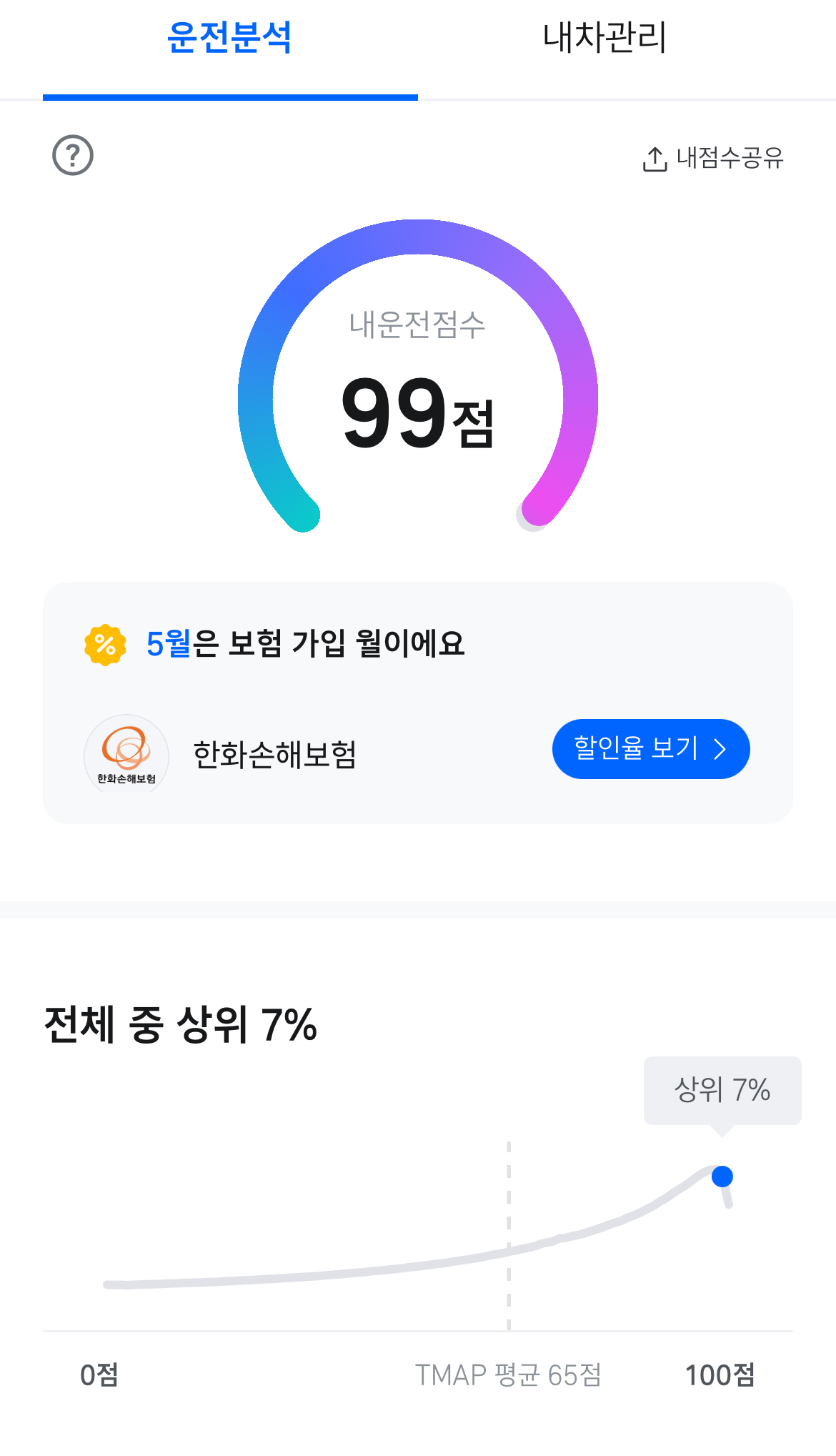 500km 주행동안 급정거 1회 (커브 구간에서 앞에 차량이 서있는걸 상당히 근접해서 발견...)를 기록해 99점을 달성했고 애니카 할인 19%를 받았다.
