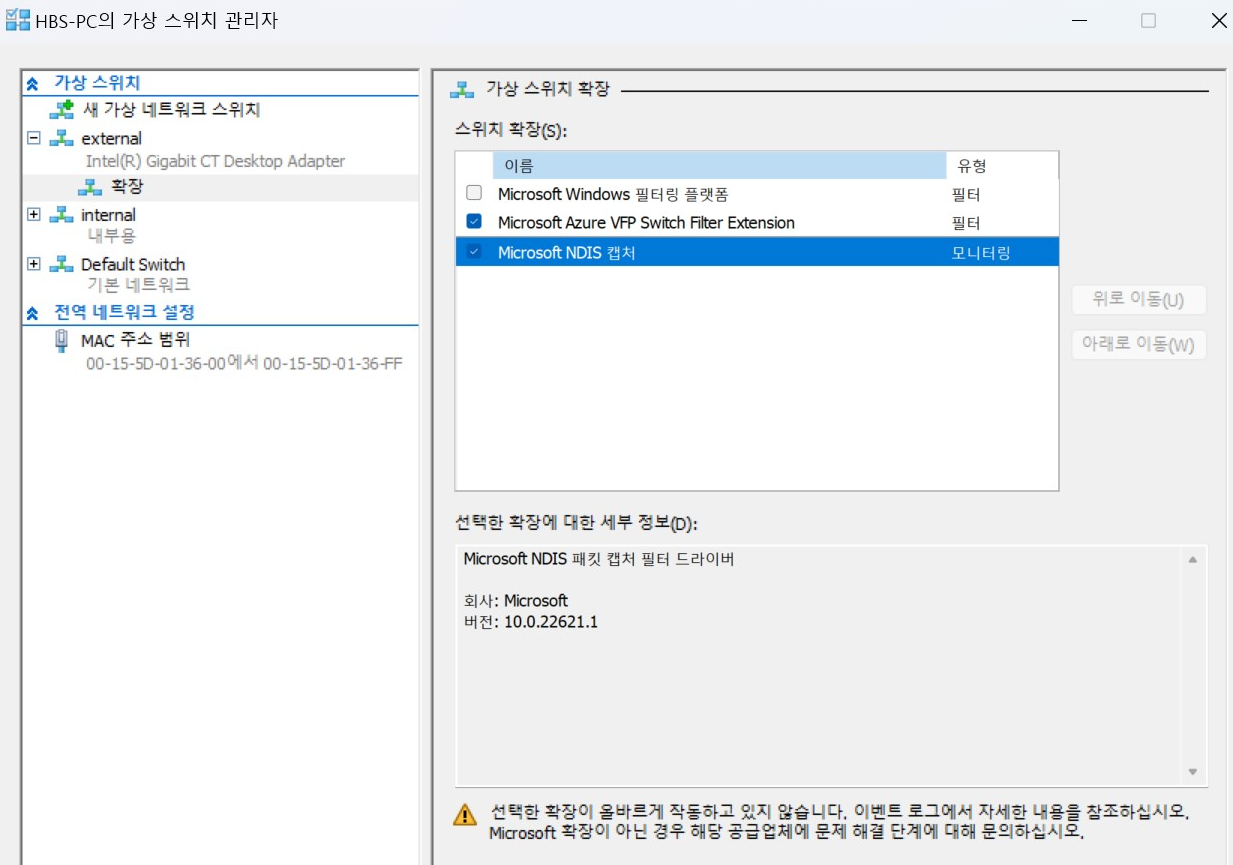 여기 나온대로 Hyper-V의 가상 스위치 관리자에서 external에 +를 눌러 "확장"을 들어가보니 정말 Microsoft NDIS 캡쳐에 문제 아이콘이 떠있었다.