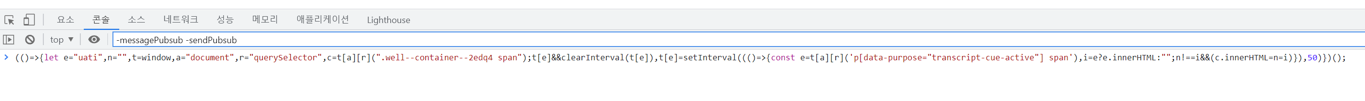 - F12 -> Console 패널에서 하단 스크립트 입력후 엔터